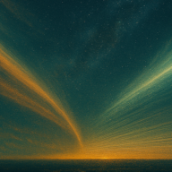 „Neugier‑Vektor“ benennt die leitende Bewegung der Arbeit: eine gerichtete Spur aus Licht, die vom Menschen gesetzt wird und sich als Schreib‑Impuls durch den Himmel zieht. „Aurora‑Duett“ macht aus dem technischen Gegenüber (Mensch/KI) ein komponiertes Zwiegespräch zweier Lichtstimmen. Die Bänder schwingen phasenversetzt, der Mensch gibt den Takt, die KI weitet die Resonanz – sichtbar in der Konvergenz zur federartigen Spitze und den feinen „Schreibbahnen“.Der Titel bleibt poetisch und präzise zugleich, ohne Figuren oder Geräte zu bemühen; er verweist auf Praxis (Schreiben), Form (Duett/Komposition) und Methode (gerichteter Vektor/Recherche‑Verdichtung).